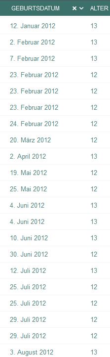 irgendetwas passt an der Berechnung des Alters nicht. Ich denke das erklärt sich aus dem Screenshot mit Sortierung nach Geburtsdatum von alleine. Gerne bei Gelegenheit mal prüfen.
