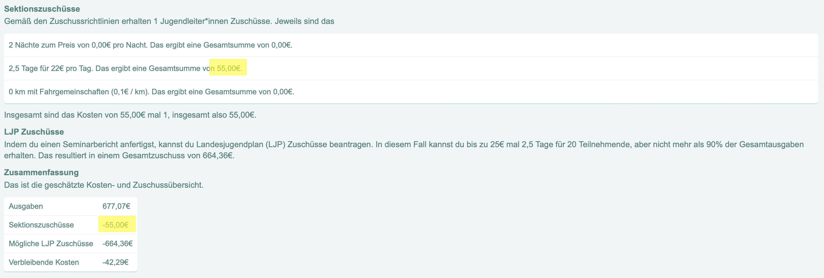 etwas ist mir bei der Berechnung der Ausfahrtenzuschüsse noch aufgefallen: in der Gesamtkostenübersicht reduzieren die Aufwandsentschädigungen die gesamtkosten der Ausfahrt. Hier sollten nur die Zuschüsse für ÜN und Anfahrt reinzählen, da die Aufwandsentschädigung für den/die JL bestimmt sind und ich nicht insinnuieren würde, dass die zur Reduktion der Kosten führen sollten.
