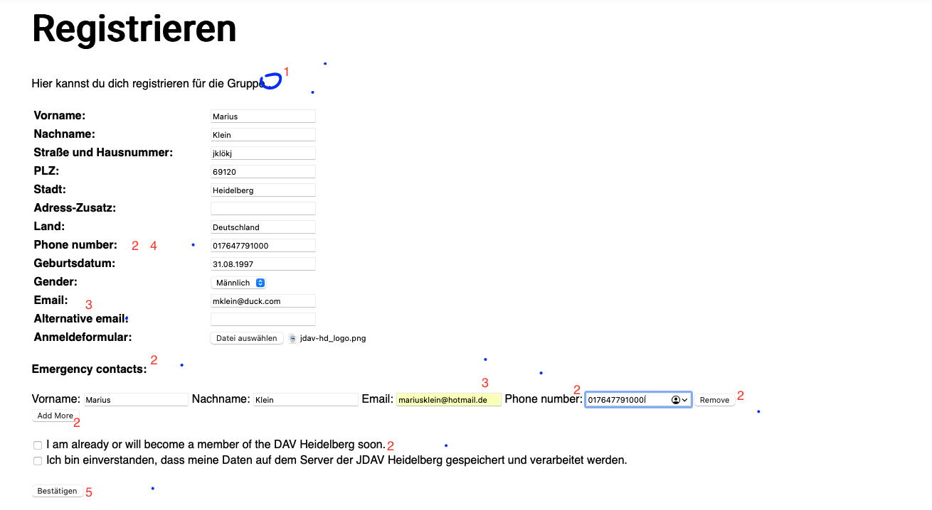 Ok passt, ist es möglich, generell Hinweise fürs ausfüllen zu geben. z.B. bei E-Mail und alternative Mail, dass da Adressen beider Eltern oder Eltern und Kind eingetragen können, wenn vorhanden?