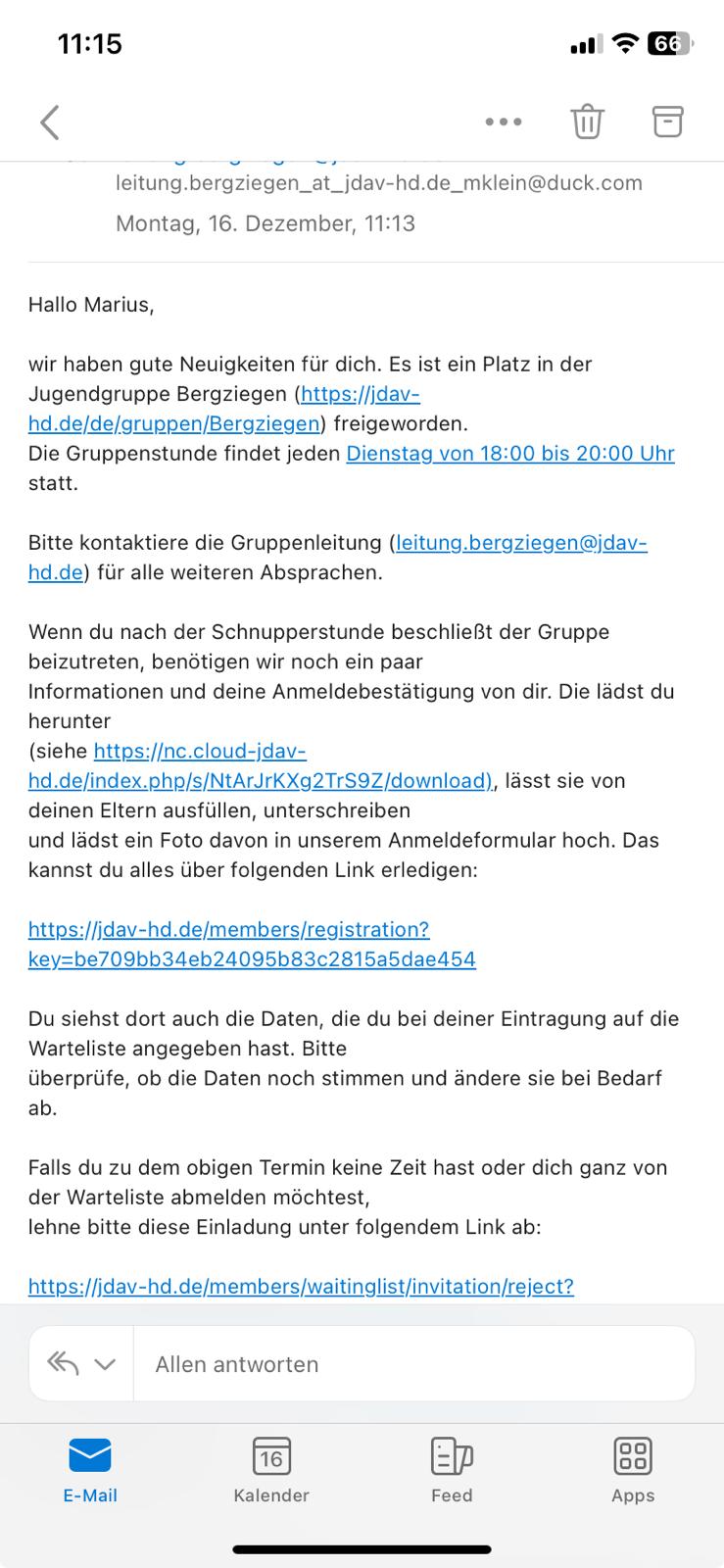 wir haben gute Neuigkeiten für dich. Es ist ein Platz in der Jugendgruppe Kletterfüchse (https://dev.jdav-hd.merten.dev/de/gruppen/Kletterf%C3%BCchse) freigeworden. Wir treffen uns jeden Mittwoch von 14:50 bis 16:25 Uhr.