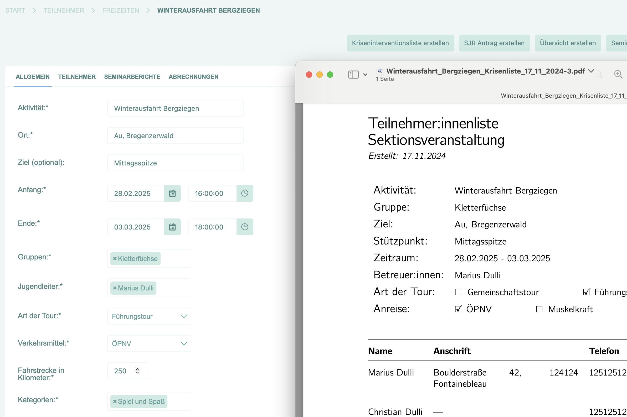 5. hmm nee ich glaube das würde gerade bei der tabellarischen Übersicht auch schwer werden. einfachster fix wäre wahrscheinlich, dass man entweder die aktuelle Funktionalität nutzt (Felder für Alpinziele, etc.) oder nur TN-Liste und Kostenübersicht runterlädt?