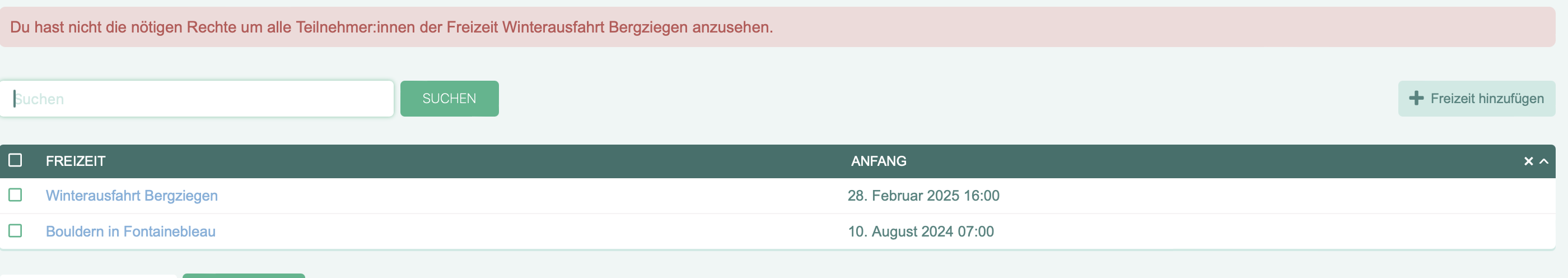 3. ich hab jetzt nicht den Detail-Überblick, welche Details über die Listenansicht sichtbar sind (ist da was kritisches dabei?). Aber ich fände es vertretbar, wenn alle JLs diese grobe Ansicht haben könnten ( dementsprechend TN zur ausfahrt hinzufügen). Krisenliste ist dann nochmal was anderes und fände ich vertretbar, wenn die nicht alle erstellen könnten. wäre dann interessant zu wissen wie man Juleis dieses Recht dann geben könnte ( praktischer Anwendungsfall: meine Gruppenausfshrt hat noch Plätze frei und ich hemm nehme andere Kinder mit ).
