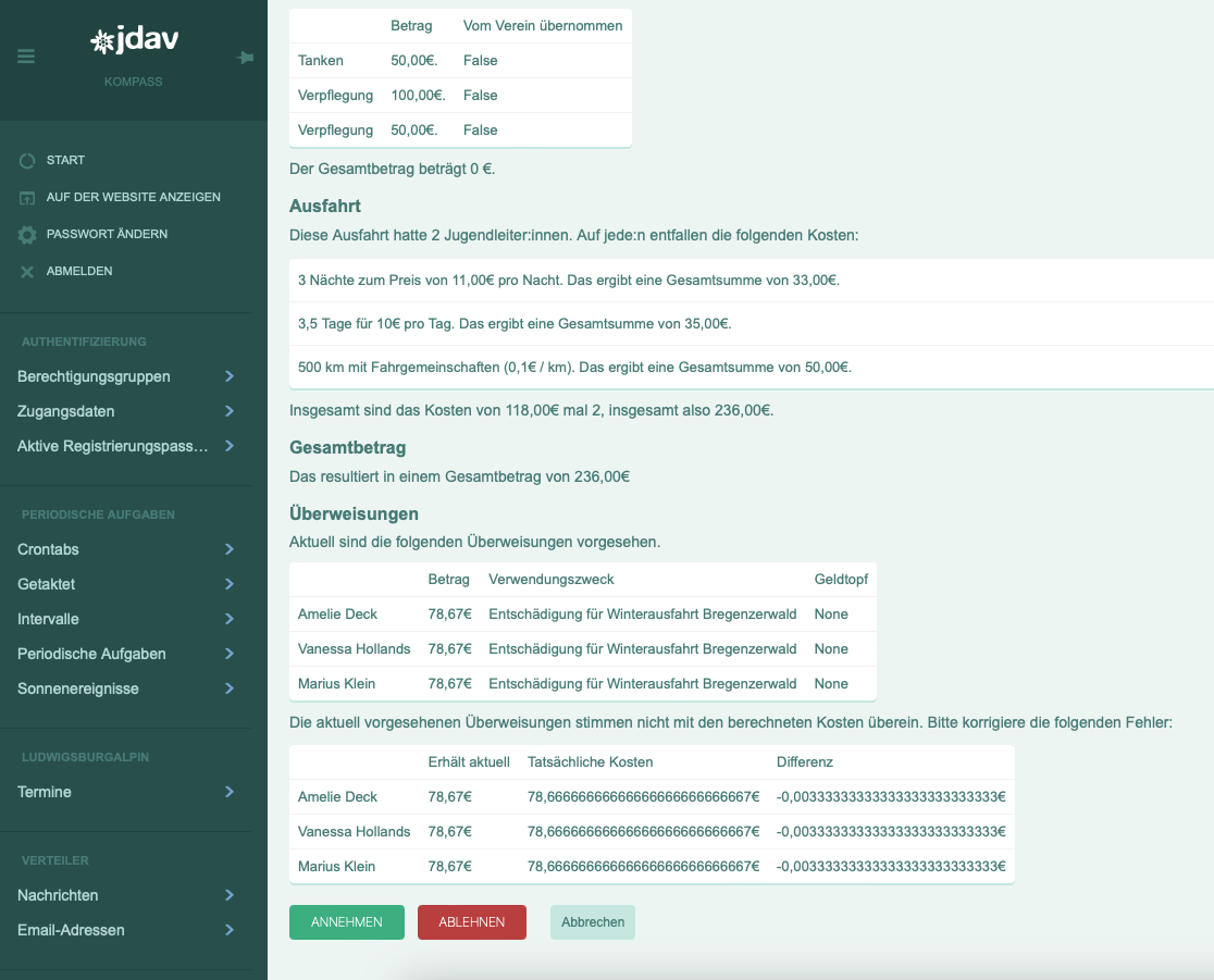 Wenn Abrechnung eingereicht: Ich habe festgestellt, dass als Tagessatz Aufwandsentschädigung 10€ eingetragen sind. Das sind aktuell 22€. Bei meiner Test-Ausfahrt hatte ich 3 JL eingetragen (sowohl im Tab Allgemein, als auch im Tab TN), bei 6 TN hab ich aber nur 2 genehmigt bekommen, da hat der Algorithmus den auszuzahlenden Betrag einfach durch 3 geteilt (Screenshot). Praktisch muss Finanzwart aber eine Aufwandsentschädigung an genau einen Menschen auszahlen und Zuschüsse zu Anfahrt/ÜN auch an einen definierten Menschen. Kannst du das hart verdrahten, dass er in diesem Fall (JL genehmigt) 2 Überw. mit voller Aufwandsentsch. erstellt und eine extra Überw. mit Zuschuss ÜN/Anreise (Empfänger zufällig oder von oben, kann ja manuell angepasst werden)?