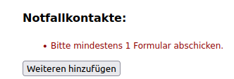 Registrierungsformular Notfallkontakt Fehlermeldung